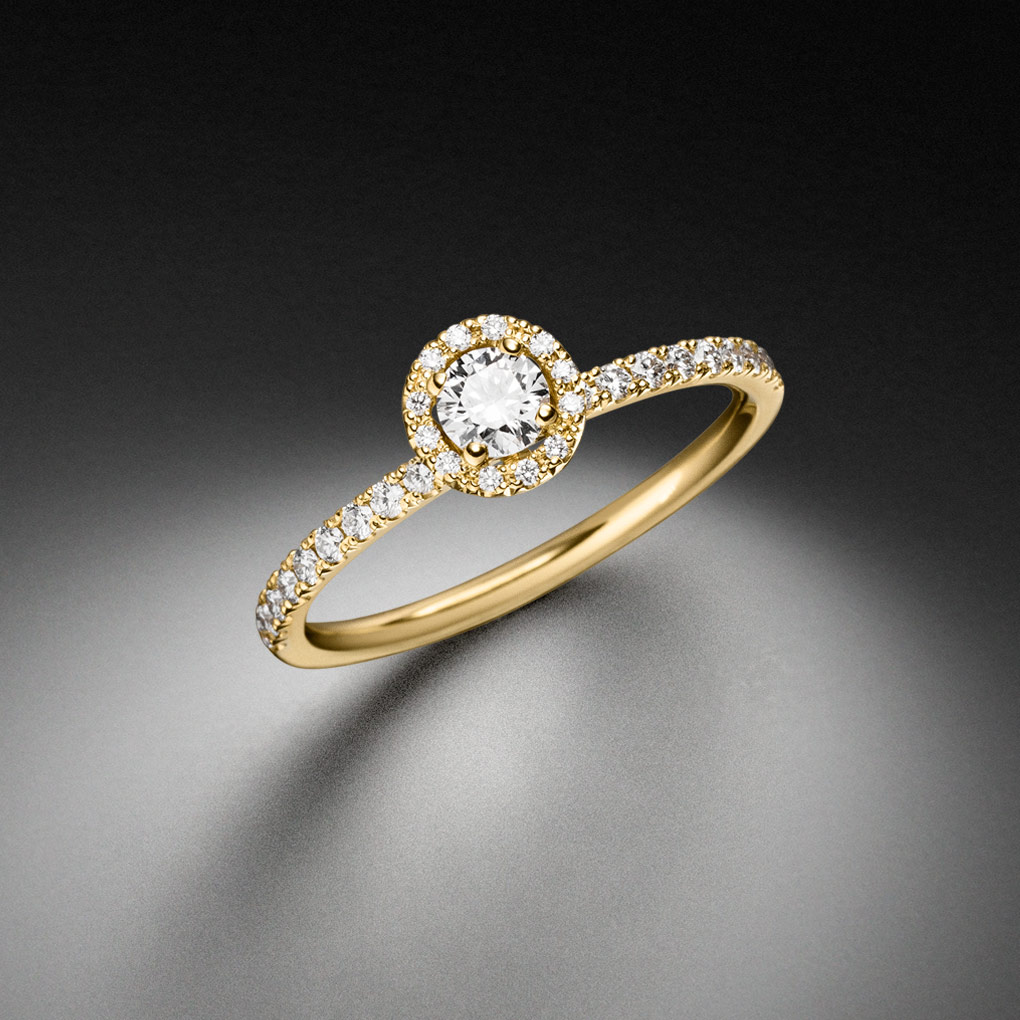 Diamant Halo Solitär Ring aus 750 Gelbgold, in sorgfältiger Handarbeit gefertigt und bewusst filigran proportioniert. Das Design lebt von seiner Klarheit: Ein zentraler Diamant im Brillantschliff von 0,25ct bildet den ruhigen Mittelpunkt des Rings und wird von einer zarten Halo-Fassung umrahmt, die seine Brillanz elegant verstärkt, ohne dominant zu wirken.
