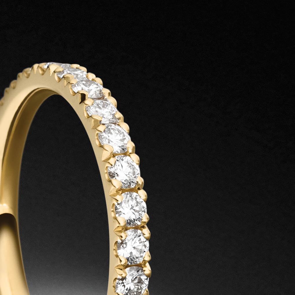 Die rundum gefassten Brillanten entfalten aus jeder Perspektive ihre volle Strahlkraft. Durch die hochwertige Ausfassung funkelt der Ring bei jeder Bewegung – selbst wenn er sich am Finger leicht dreht, bleibt sein Erscheinungsbild stets vollkommen harmonisch.