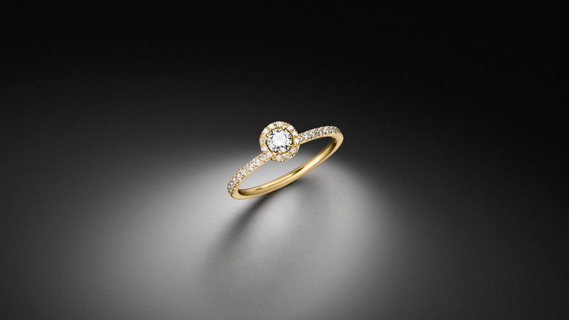 Diamant Halo Solitär Ring mit 0,25ct zentralem Diamant und weiteren 0,22ct Diamanten im Brillantschliff gefertigt in 750 Gelbgold – STEINBACH Goldschmiede