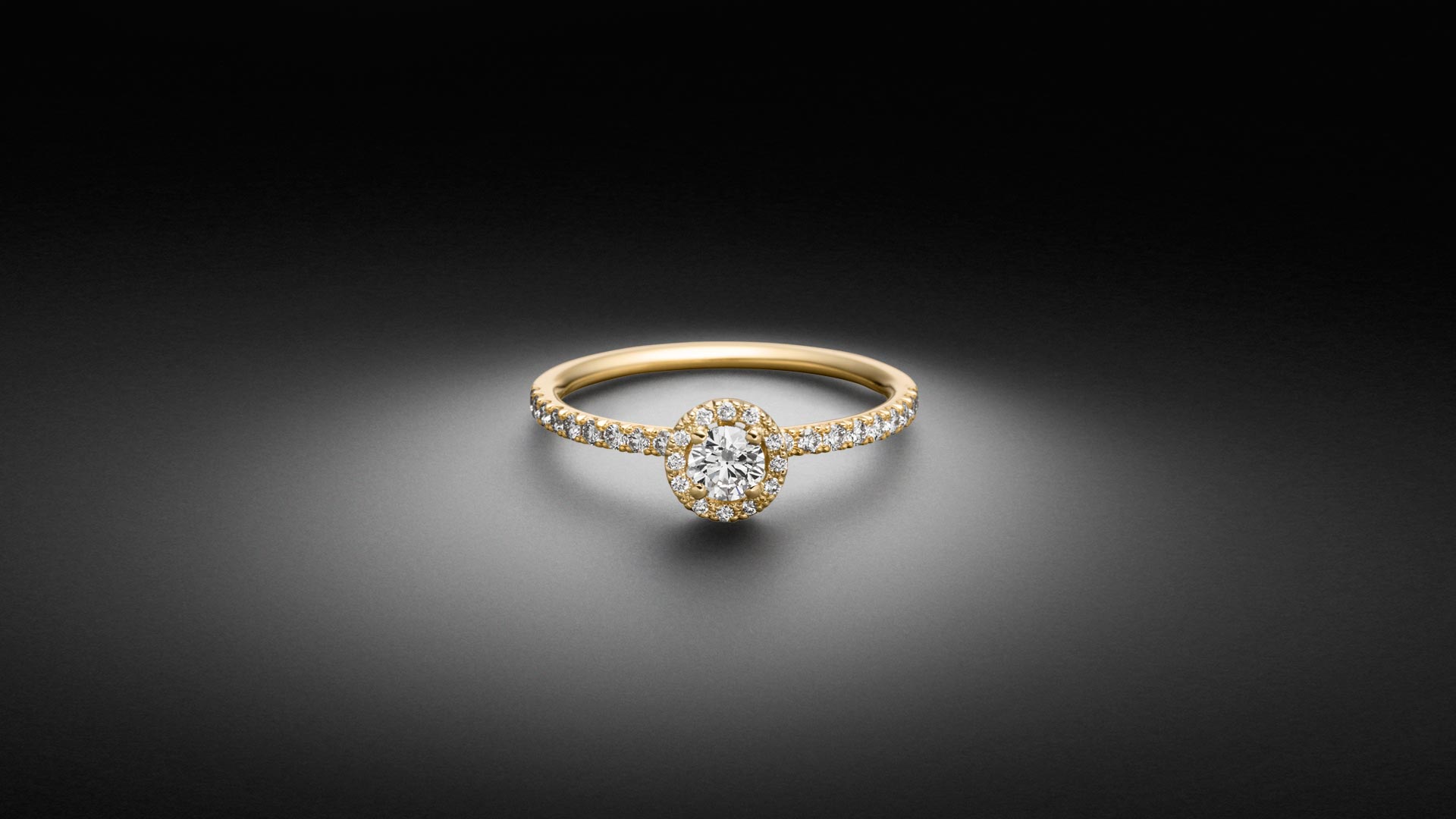 Diamant Halo Solitär Ring mit 0,25ct zentralem Diamant und weiteren 0,22ct Diamanten im Brillantschliff gefertigt in 750 Gelbgold – STEINBACH Goldschmiede