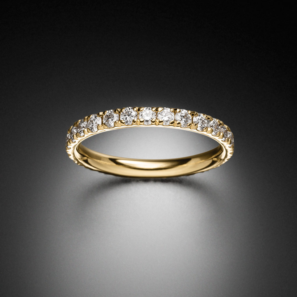 Die rundum gefassten Brillanten entfalten aus jeder Perspektive ihre volle Strahlkraft. Durch die hochwertige Ausfassung funkelt der Ring bei jeder Bewegung – selbst wenn er sich am Finger leicht dreht, bleibt sein Erscheinungsbild stets vollkommen harmonisch.